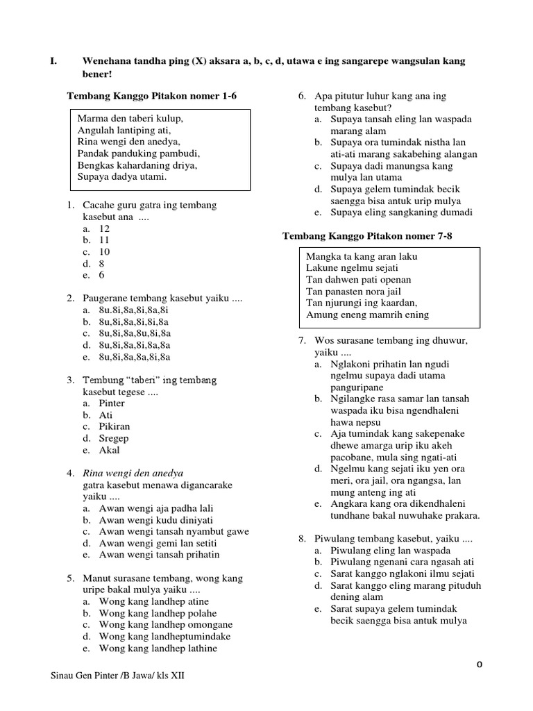 Tembung geguritan asale saka tembung gurit kang ateges gubah, karang, sadur. Dadi wong aja rumangsa bisa. Tembung priyangga ing tembang kasebut ateges …. Bu guru ngagem buku saking kantor b. Guru wilangan gumantung saka kalungguhan utawa panggonane larik sajrone pada ing sawijining pola sajak. Ing antarane yaiku tembang gedhe, tembang tengahan, tembang cilik utawa umume diarani tembang macapat, lan tembang dolanan. Agama iku dadi tuntunane wong urip. Saka tembung nom utawa godhong asem = sinom. Pangkur (14 pada) ana ing serat wedhatama pupuh pangkur duweni piwulang ngelmu kang sempurna, kang dadi pathokaning kanggo manungsa yaiku babagan sopan santun. / saka tower pengintai, pengunjung bisa ndelok apa ae ing apa sebabe penangkaran penyu ora oleh suwi?.bu guru ndamel buku saking kantor c. Ancase ya padha karo ibadah pasa ing sasi pasa, yaiku reresik jiwa raga. Dadi murid iku kudu bekti aben dina sinaukang nyata sinaune kanthi sae nduwe sikap kang luhur lan kang jujur. Tembung kang trep kanggo njangkepi ukara kasebut yaiku.